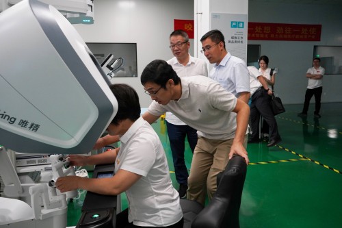 7月6日上午,縣科技局黨組書(shū)記、局長(zhǎng)杜玉玉一行在康基醫(yī)療副總經(jīng)理、黨支部書(shū)記岳計(jì)強(qiáng)和唯精醫(yī)療總經(jīng)理潘博的陪同下,參觀了杭州唯精醫(yī)療機(jī)器人有限公司,詳細(xì)了解了國(guó)產(chǎn)手術(shù)機(jī)器人的應(yīng)用及發(fā)展前景。